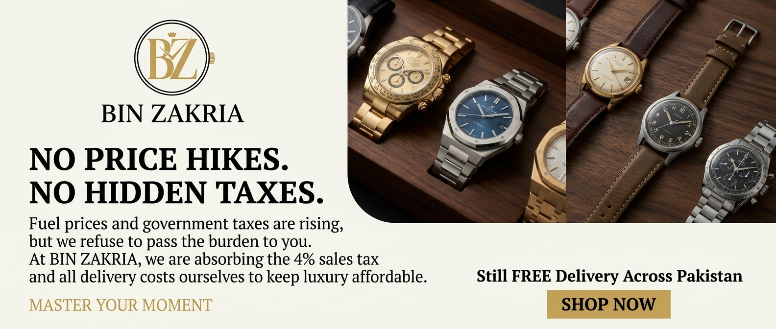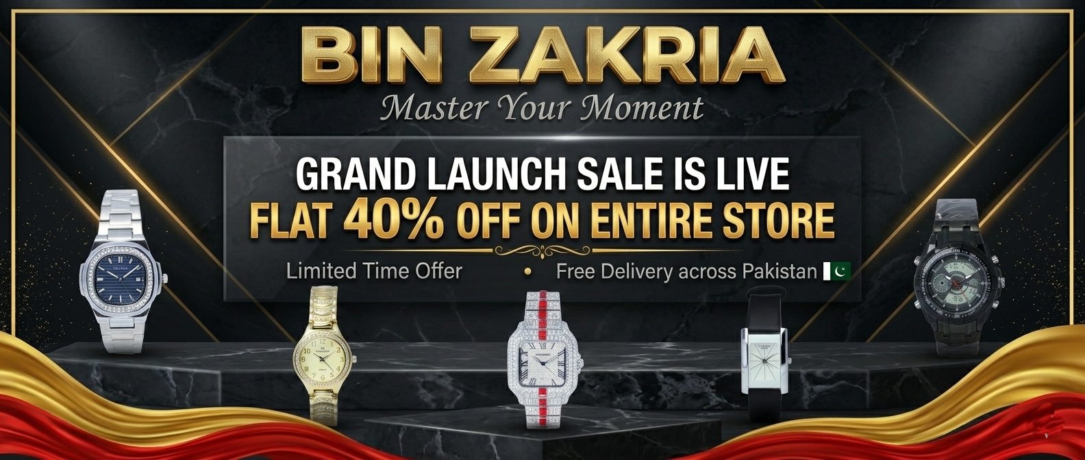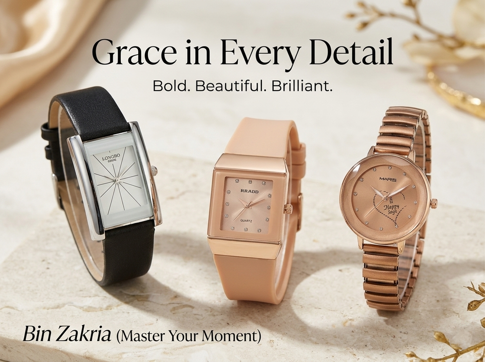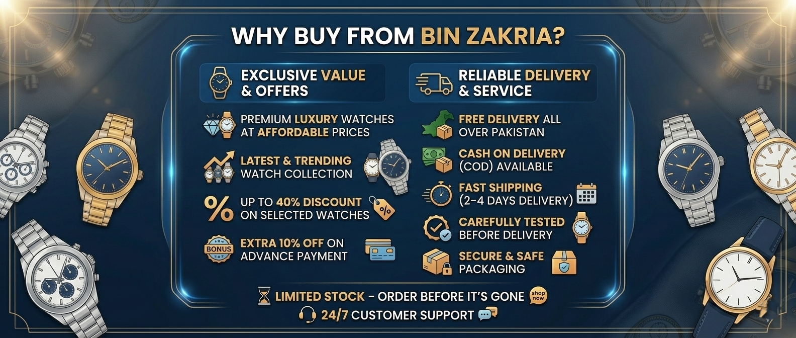 Bin Zakria offers premium quality watches at honest prices, with strict quality checks, fast delivery, easy returns, and reliable customer support — ensuring a safe and satisfying shopping experience.